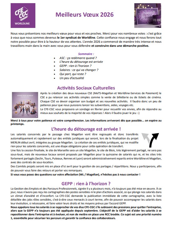 Grâce à votre confiance, la CFE-CGC est devenue le 1er syndicat de Worldline et s’engage à défendre vos droits dans un contexte de transformations intenses. Face aux incertitudes sociales et stratégiques, nous restons pleinement mobilisés pour une évolution responsable, humaine et transparente, à votre service.