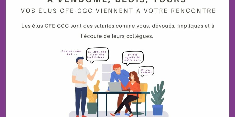 Mercredi 5 mars et jeudi 6 mars 2025 les élus CFE-CGC sont sur les sites de Vendôme, Blois et Tours pour échanger avec vous et répondre à vos questions.